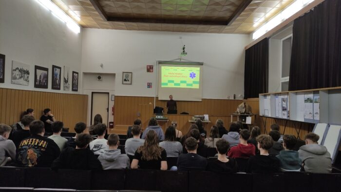 I letošní školní rok probíhá v hodinách tělesné výchovy odborné proškolení žáků 1. ročníků o první pomoci. První hodinový blok se věnuje krizovým situacím s odkazem na důležitost tísňových linek. Druhý blok seznamuje žáky se základními pokyny pro poskytnutí nezbytné laické pomoci. Prakticky si mohou vyzkoušet resuscitaci na figuríně, zástavu krvácení, stav dušení atd. Žáci jsou proškolováni záchranářem a operátorem tísňové linky Miroslavem Mojzesem, který odborný výklad obohacuje pracovními zkušenostmi. Panu Mojzesovi moc děkujeme za vstřícnou každoroční spolupráci.